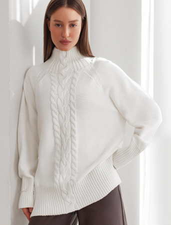 Свитер выполнен из мягкой хлопковой пряжи фактурной вязки с добавлением акрила. Модель связана изнаночной петлей, в сочетании с которой узор косы и высокие рибаны поддерживают ирландский стиль, который всегда в тренде. Комфортный ворот стойка хорошо защищает от ветра. Боковые разрезы поддерживают расслабленный свободный силуэт. Изделие сочетается с любым низом и не требует дополнительных аксессуаров.
