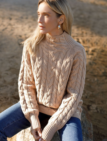 Свитер выполнен из мягкой хлопковой пряжи фактурной вязки с добавлением акрила. Удлиненная модель силуэта over-size с воротом-стойка и узором косы во всю длину. Хорошо поддерживает тепло, при этом не перегревая тело. Сохраняет первоначальный внешний вид даже после множества стирок. Свободный силуэт позволяет носить изделие на футболку или рубашку с любым низом. Из украшений металлический логотип бренда.