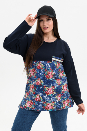 Туника женская прямого силуэта, горловина округлая. На верхней части полочки и спинки по два рельефа. Рукав цельнокроеный со швом. Верхняя часть туники, рукава из однотонной ткани, нижняя часть из набивного футера цветы. На полочке нагрудный карман с декоративной тесьмой. В боковых швах разрезы.