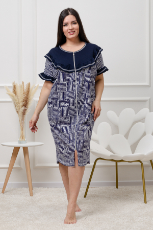 Халат женский, полуприлегающего силуэта , горловина округлая, застежка на тесьму-молнию. На полочке кокетка с рюшей, также рюша внизу цельнокроенного короткого рукава из отделочной ткани. Внутренние горизонтальные карманы в шве стачивания верхней и нижней части полочки.