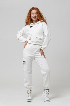 Женский костюм двойка из интерлока. Состоит из укороченной толстовки и брюк. Толстовка с капюшоном, два фальш кармана на полочке и нашивка. Имеется карман с клапаном на рукаве. На брюках две пары карманов, нашивка, верх и низ брюк выполнен резинкой. Модель 42 размера, костюм на ней так же 42 размера.