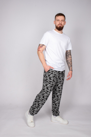 Стильные мужские джоггеры с модным в этом сезоне камуфляжным принтом подойдут любому парню, который любит собирать модные и удобные образы. Пояс отрезной, с резинкой и шнуром внутри. Брюки с карманами на передней половинке с отрезным бочком. По низу брюк манжеты с эластичной тесьмой внутри. Изготовлены из петельчатого футера с добавлением полиэстера и эластана. Подойдут на рост 182см.