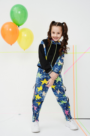 Костюм детский свободного силуэта состоит из толстовки и брюк. Толстовка с нагрудным кармашком в швах, объемным капюшоном с ярким шнурком. Рукав толстовки оформлен накладным кармашком с клапаном и декоративной тесьмой. Низ рукавов обработан манжетами из эластичной рибаны. Джоггеры свободного силуэта с большими накладными карманами с клапанами оформленными декоративной тесьмой. Низ брюк обработан функциональной застежкой молнией, которая заужает объем брючин снизу для удобства, если носить высокие ботинки-сапоги. В пояс брюк втачена широкая эластичная рибана.