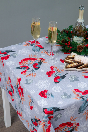 Скатерть Снегири и рябина станет главным украшением Новогоднего стола Яркие красные птицы и ягоды отлично сочетаются с серым фоном и белыми снежинками. Скатерть выполнена из 100% хлопковой рогожки, благодая чему сохраняет первоначальный вид даже при постоянном использовании. Подарите новогоднее настроение себе и своим близким уже сейчас.