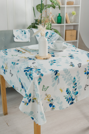 Светлая скатерть с бабочками и веточками одноименного растения Мирт добавит света и ярких красок кухне. Скатерть изготовлена из высококачественной рогожки со стойкими натуральными красителями.