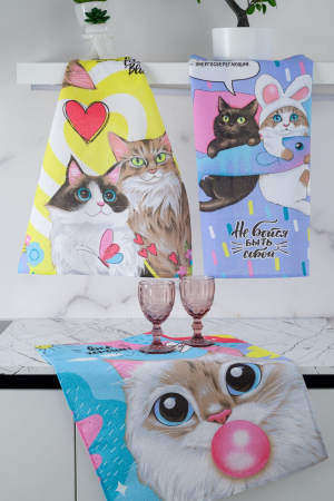 Набор из трех вафельных полотенец Кис Кис с милыми котиками отлично подойдет для кухни. Полотенца с петелькой удобны для протирания рук, посуды и любых поверхностей. Изделия из 100% хлопка отлично впитывают влагу, Вафельная структура ткани делает полотенца мягкими и приятными на ощупь.