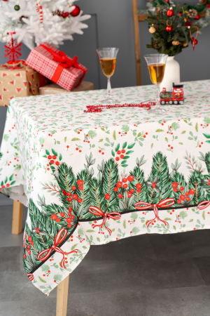 Белая скатерть на прямоугольный стол с зимним рисунком Зимний сон отлично подойдет к любому интерьеру кухни. Красные ягоды, банты и веточки ели на рисунке помогут создать уютную и волшебную атмосферу на кухне. Скатерть представлена в трех размерах от 120*150 на небольшой кухонный стол, до 220*150 на стол для большой компании. Такая скатерть может служить готовым подарком для близких на любой праздник, в том числе Новый год. Скатерти из рогожки подходят как для особого случая так и для ежедневного использования,она не боится машинной стирки, не садится и не теряет яркости красок.