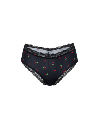 Трусики Hipster со средней посадкой выполнены из мягкой ткани с принтом "Вишенка" с кружевной лентой по талии и краю тожек. Подгиб и плоский шов спереди. Ластовица из хлопка.