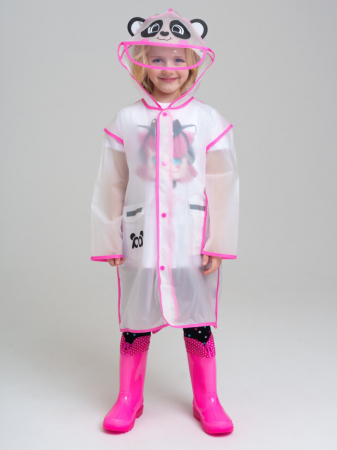 Дождевик детский для девочки. Дождевик с пандой с козырьком и объемными ушками. Застежка на кнопки. Материал полупрозрачный ЭВА. Без подкладки. Модель имеет спереди два накладных кармана с клапаном. Сзади заложена широкая складка с клапаном с кнопкой на уровне талии для изменения объема плаща. Есть светоотражающие элементы спереди и сзади. Добавлена петелька под капюшоном с внешней стороны, чтобы остальные вещи на вешалке не намокали. Модель идеально сочетается с резиновым сапогам и зонтом из коллекции. В комплекте идет непромокаемая сумочка.