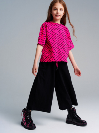 Кюлоты из качественного и приятного на ощупь трикотажа джерси. Высокое содержание хлопка 95%. Благодаря наличию эластана в составе ткани изделие проще в уходе и держит форму. Эластичный пояс со шнуром.