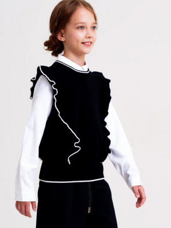 Классический темно-синий школьный вязаный жилет для девочки подростка от PlayToday — стильная и комфортная деталь школьного гардероба, созданная для особых, запоминающихся образов. Прямой силуэт, мягкий вязаный трикотаж с высоким содержанием хлопка и нежный декор из рюш делают эту стильную трикотажную жилетку в школу не только удобной, но и по-настоящему нарядной.