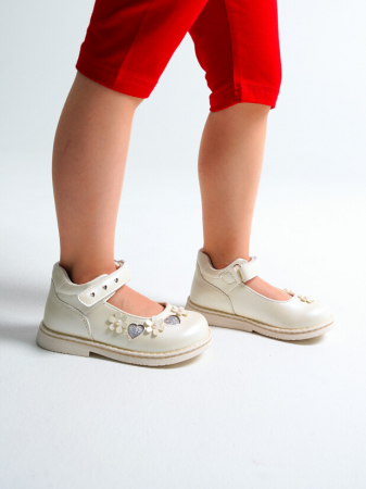 Туфли из искусственной кожи и украшены объемными цветочками. Ремешок с липучкой надежно фиксирует стопу ребенка. Подкладка и стелька выполнена из натуральной кожи. Стелька с анатомической формой способствует равномерному распределению давления и препятствует развитию плоскостопия. Эргономичная форма колодки обеспечивает правильное формирование стопы ребенка. Подошва из терморезины гибкая, лёгкая и не скользит.