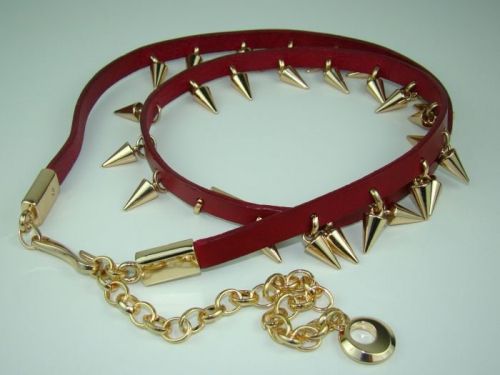 Красный ремень из натуральной кожи с декором в виде металлических вставок и цепочки, шириной 10мм.