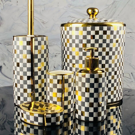 Набор аксессуаров для ванной комнаты состоит из пяти предметов: мыльница, дозатор для жидкого мыла, стакан зубных щеток, ершик для унитаза со стаканом, емкость для мелкого мусора. Набор выполнен из высококачественного фарфора с шахматным декором и золотыми элементами