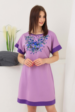 Сорочка с цельнокроенным рукавом, двойной манжетой по линии низа и рукавов из ткани-компаньона. Печать - анютины глазки, полноцвет
