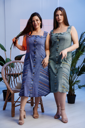 Сарафан женский полуприлегающего силуэта, к низу слегка расклешенный. На полочке и спинке рельефы. Застежка на петли - пуговицы, планка. Передние бретели, боковые части полочки и спинки, верхние декоративные клапана полочки из ткани в полоску, что придает изделию особую неповторимость.