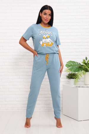 Пижама женская: футболка прямого кроя, с короткими рукавами, с милейшим принтом на полочке, брюки с боковыми карманами (крой Бананы), укороченные, на эластичном поясе декоративный шнурок.