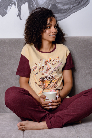Домашний костюм с кофейным принтом. Футболка слегка приталенного силуэта со спущенной проймой. Рукава и брюки с цельнокроеными манжетами. Горловина обработана бейкой. Брюки не свободного кроя, заужены к низу. Пояс обработан эластичной широкой резинкой 3 см. В боковых швах карманы. Благодаря наличию в составе ткани полиэстера, колени на брюках не вытягиваются. Оттенок бордо может отличаться