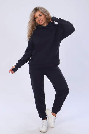Модный женский костюм в стиле oversize выполнен из футера 3-х нитки с начёсом. С появлением этой модели у модниц он стал излюбленной вещью гардероба. Причиной тому служит множество достоинств: натуральный состав, необыкновенная мягкость, гипоаллергенность, формоустойчивость (при правильном уходе и стирке 30-40 С). Костюм состоит из объёмной толстовки с капюшоном и брюк с боковыми карманами. Манжеты рукавов и брюк выполнены из качественного кашкорсе не деформирующегося со временем. В свою очередь манжеты рукавов в данной толстовке удлинённые с прорезью для большого пальца. Это очень удобная деталь для прогулок в прохладную погоду, когда перчатки ещё надевать не хочется, а Ваши ручки уже начинают мёрзнуть. Линия плеча на толстовке спущена. Длина рукава указана от точки основания шеи. Пояс брюк выполнен на специализированной машине.