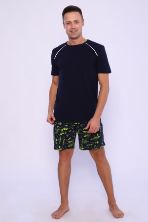 Мужской костюм состоит из футболки и шорты. Шорты с карманами, длина чуть выше колена. Есть голубой и темно-синий цвет, состав 100% хлопок. Комплект состоит из широкого размерного ряда. Отличный и удобный вариант на каждый день.