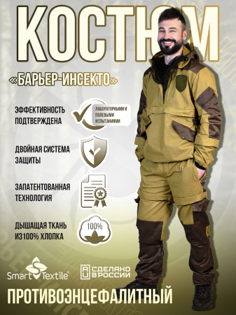 - Костюм от клещей Барьер-Инсекто с микрокапсульной акарицидно-репеллентной обработкой от клещей это надёжная защита от клещевого энцефалита и других инфекций. Он позволяет наслаждаться природой, не беспокоясь о своей безопасности.