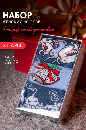 Новогодний подарочный набор женских носков с изображением тройки лошадей, зимнего пейзажа и новогодних колокольчиков. В комплекте 3 пары в красивой картонной упаковке