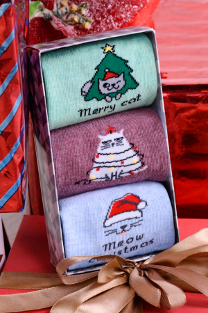 Новогодний подарочный набор женских носков с милыми котятами и надписями. В комплекте 3 пары в красивой картонной упаковке