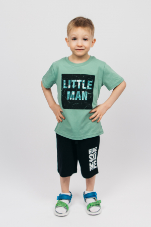Футболка для мальчика выполнена из 100% хлопка. Футболка прямого силуэта, с втачным коротким рукавом. Благодаря эластичной горловине, выполненной из рибаны, футболку удобно снимать и надевать. На полочке принт Шелкография. Надпись переводится как Маленький человек. Материал не растягивается и не деформируется.