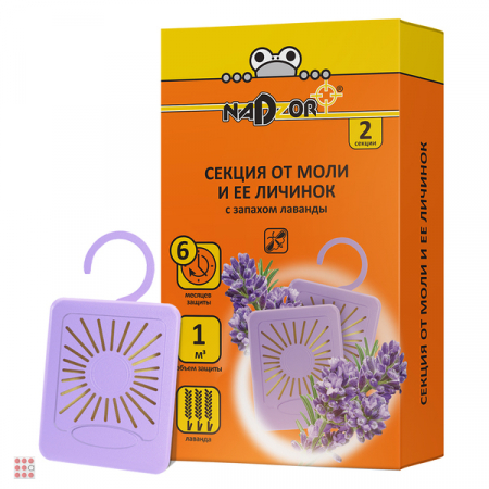 Секция с запахом лаванды для применения в гардеробах, шкафах и ящиках. Эффективно защищает от моли и ее личинок (до 6 месяцев). 2 секции в наборе.