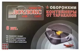 Контейнеры от тараканов "Дохлокс" — Предназначен для уничтожения всех видов тараканов на объектах с повышенными требованиями к гигиене (жилых помещениях, детсадах, яслях, предприятиях общепита, объектах ветеринарии и содержания животных). Представляет собой небольшой пластиковый контейнер с приманкой внутри, недоступной для детей и домашних животных.