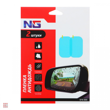 Пленка полиэтиленовая NG «Антидождь» овал 12,7х8,7 см устанавливается на зеркала заднего вида автомобиля и позволяет сохранить качественный обзор во время вождения при сложных погодных условиях, что обеспечивает дополнительную безопасность на дороге. Обладает водоотталкивающими свойствами и устойчивостью к царапинам. Пленка не запотевает, на ней не оседает пыль, не остаются отпечатки пальцев. Легко устанавливается по инструкции на упаковке. 2 штуки в наборе.