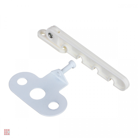 Состоит из двух частей, одна из которых крепится на створку, а вторая на раму окна.