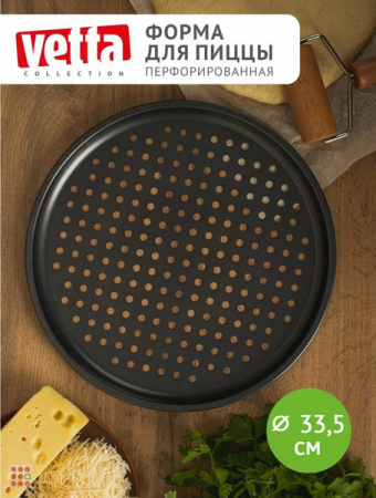 Форма для пиццы перфорированная, диаметром 33,5 см и высотой бортика 1 см изготовлена из углеродистой стали, с 2-х слойным антипригарным покрытием серого цвета изнутри и снаружи предназначена для использования в духовых шкафах.