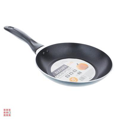 Сковорода диаметром 20 см из штампованного алюминия с 2-х слойным антипригарным покрытием черного цвета, с бакелитовой черной ручкой и однослойным дном - подходит для всех типов плит, кроме индукции.