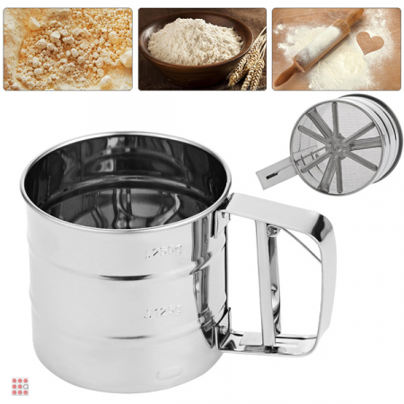 Незаменимая помощница на кухне кружка-сито механическая легко просеет муку, крахмал, какао или сахарную пудру, даже в узкую емкость . Это сито порадует Вас компактными размерами и прочностью. Оно очень удобно в работе: нужно только засыпать в него муку и несколько раз нажать ручку.