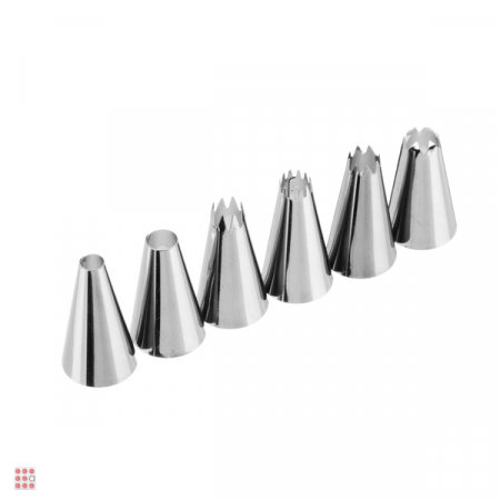 Насадки VETTA используются для фигурного нанесения крема из кондитерского мешка на торты и капкейки, а также любые другие десерты. Предназначены для создания декоративных элементов с мелким рифлением. С их помощью вы сможете украсить свое кондитерское изделие звездами, ракушками, рифленым бордюром и т.п. Также используется при работе с тестом. В наборе 6 насадок из нержавеющей стали.