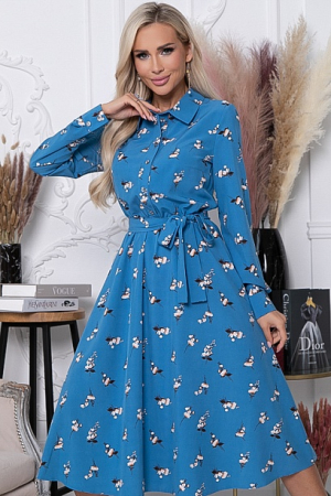 * Платье из текстильного полотна, отрезное по линии талии, присобрано на эластичную резину. Горловина оформлена отложным воротником на стойке. По полочке-планка до талии с застежкой на петли и пуговицы. Юбка изделия расклешенная и летящая. В комплекте длинный пояс из основной ткани.