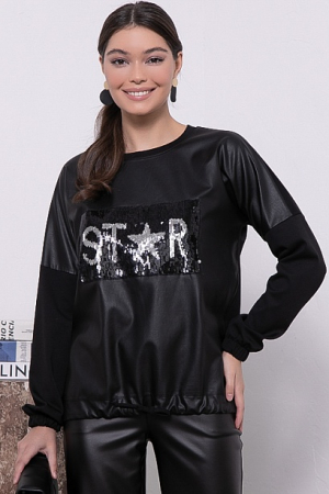 Комбинированный джемпер из трикотажного полотна джерси и экокожи,свободного силуэта с кулиской по низу.