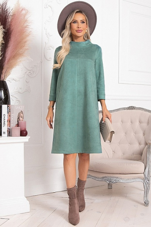 Платье А-образного силуэта из экозамши.По переду декоративные линии с отстрочкой, и функциональные карманы.Воротник стойка.