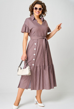 Платье женское нарядно-повседневное полуприлегающего силуэта расширенное к низу. Выполнено из хлопка.Вырез горловины фигурный, воротник на стойке рубашечного типа. Рукав спущенный по низу с воланом собранным на сборку. Платье отрезное по талии. Юбка ассиметричная с застежкой доверху на обметанные петли и пуговицы. По низу юбки притачной волан, в боковых швах обработаны карманы. Декором платья служит дизайн ткани, съемный пояс из основной ткани и отделочные пуговицы.