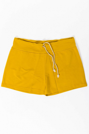Женские шорты выполнены из футер петли ярких расцветок. Силуэт облегающий, пояс широкий со шнурком. Без карманов.