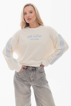 Женская толстовка выполнена из футера трехнитки «воздушка», что делает изделие мягким и комфортным в носке. Модель свободного кроя со спущенным рукавом обеспечивает удобство и стильный силуэт. Горловина, пояс и манжеты выполнены из эластичного кашкорсе для лучшей посадки. Рукава украшены лампасами, придающими образу динамичность, а спереди расположен аккуратный принт, добавляющий яркий акцент. Отличный выбор для повседневных образов.
