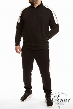 Костюм из однотонной футер петли трёхнитки воздушка с отделочными полосами на брюках и верхних частях рукавов. Брюки с притачным поясом и манжетами внизу. В поясе через люверсы проложен шнур. Толстовка с воротником, рукавами реглан, с притачным поясом и манжетами. Спереди застёжка на молнию, с левой стороны вышивка. Толстовка и брюки с карманами по бокам.