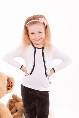 Футболка с длинным рукавом выполнена из хлопка с лайкрой. Спереди вставка с рюшами, вырез горловины и длинный рукав снизу обработаны бейкой контрастного цвета.
