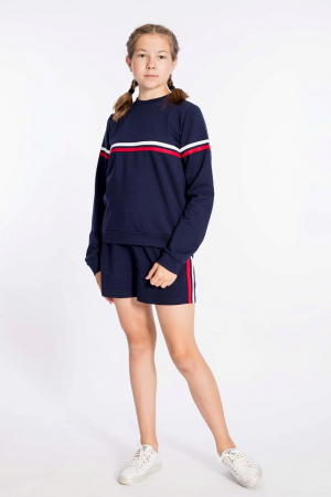 Костюм выполнен из футер петли с лайкрой, состоит из толстовки и шорт. Толстовка с длинным рукавом и круглым вырезом горловины, оформленным кашкорсе. Шорты с поясом на резине. Спереди на толстовке, рукавах и по бокам шорт отделка лампасами двух цветов.