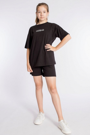 Футболка имеет короткий втачной рукав и украшена принтом спереди. Шорты слегка расширены, есть боковые карманы и притачной пояс на резинке. Костюм выполнен в однотонном черном цвете, что позволяет сочетать его с различными элементами гардероба.