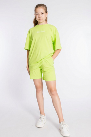 Футболка имеет короткий втачной рукав и украшена принтом спереди. Шорты слегка расширены, есть боковые карманы и притачной пояс на резинке. Костюм выполнен в однотонном салатовом цвете, что позволяет сочетать его с различными элементами гардероба.