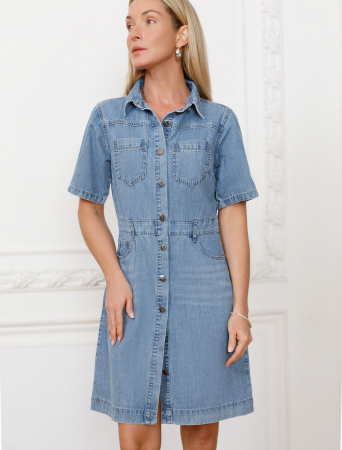 Платье выполнено из тонкого денима. Модель с пятью карманами как у джинс хорошо будет сочетаться как с открытой обувью, так и сапогами. Облегченный материал из 100% хлопка обеспечит комфорт даже в самый жаркий день. Изделие сидит по фигуре, не сковывая. Талию можно дополнительно подчеркнуть поясом.