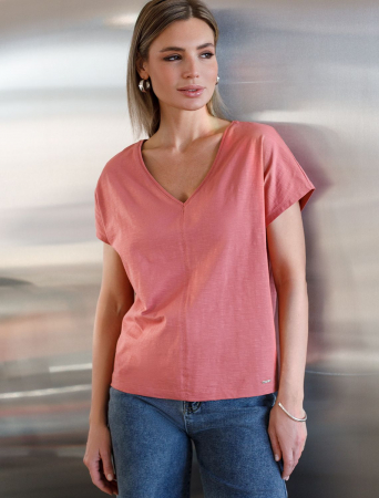 Футболка с цельнокроеным рукавом выполнена из фактурного полотна из 100% хлопка. Базовая модель свободного кроя c V -вырезом легко впишется в любой гардероб. Ткань имеет характерный рисунок черточки за счет сочетания разных волокон хлопка 140-150 г. Хорошо держит форму и поддерживает комфортный микроклимат в течении дня.