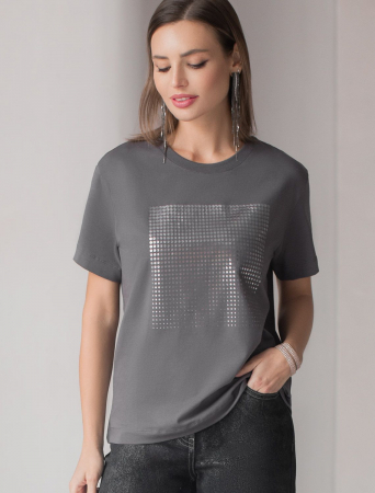 Стильная базовая футболка темно-серого цвета с серебристым принтом фольгой выполнена из плотного хлопка с эластаном для комфортной посадки на любую фигуру. Прямая футболка классического кроя с круглым вырезом, прекрасно подходит для разных типов фигуры, в том числе и на большие размеры. Мягкость хлопка вместе с небольшой долей эластана гарантирует идеальную посадку и свободу движений. Легкая натуральная дышащая ткань премиального качества делает футболку с коротким рукавом идеальным вариантом для повседневной носки дома, на работу или офис. Однотонная футболка дополнена авторским аккуратным принтом с минималистичной надписью, который придает праздничный и элегантный вид без лишней вычурности. Блестящий принт аккуратно украшает, добавляя изысканный акцент и создавая легкий мерцающий эффект.